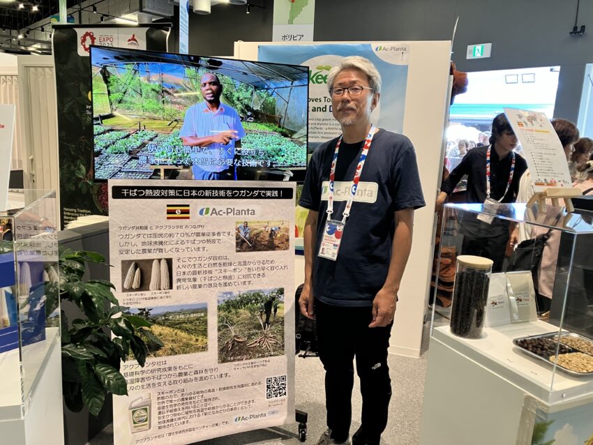 万博の開催期間中、ウガンダブースの一角で、同国の国立農業研究機構と弊社とのスキーポンの実証実験の内容や、地元の農家や農業団体の方々との連携を、動画やポスターで紹介しています。会場にはたくさんの方々が訪れており、その中で足を止めて興味深く見てくださった方もいて、関心の高さを実感しました。